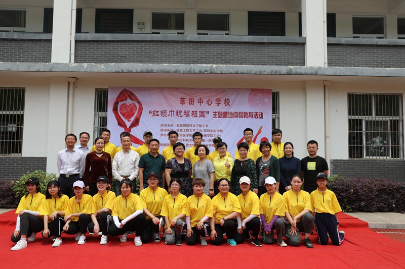为庆祝新中国成立70周年,让大山里的留守儿童真切感受节日的快乐和温暖,5月28至29日,校工会组织体育学院/体验产业学院团队参加由省教科文卫体工会主办的为农村留守儿童提供关爱服务活动,为石台县莘田中心学校和少奇红军小学校分别开展了“红领巾祝福祖国” 和“小红军祝福祖国”主题营地体验教育活动。安徽省教科文卫体工会女工委,校工会、体育学院体验产业学院,以及部分高校(附院)工会负责人参加了此次活动。活动开始前,举行了简朴而庄重的升国旗和慰问捐赠仪式。