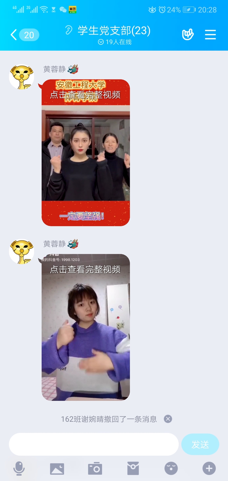 【文化防疫】在学生党支部书记黄蓉静老师的组织下,学生党员们积极在《学习强国》App上进行每日打卡学习、崇尚学习、加强学习。在吸收丰富的学习内容和资源的同时紧跟党中央步伐,学习习近平总书记重要思想以及理念。另外,黄老师在网络直播中向同学们介绍国家级非物质文化遗产——安徽凤阳花鼓,线上普及知识和传承中华民族优秀传统文化,鼓励大家利用假期延长的时间,学做更加有意义的事情。在疫情面前,抚慰家人和朋友,做到不恐慌,不害怕,相信一线战士,相信国家。
