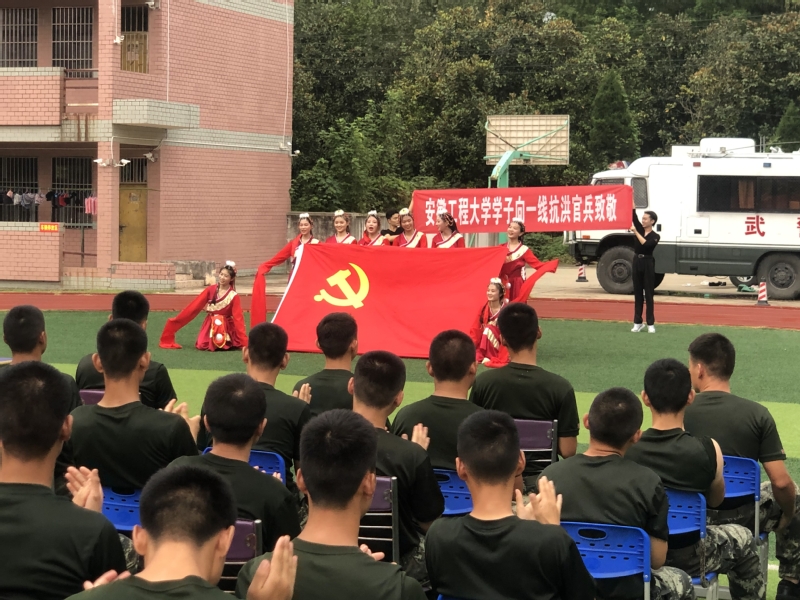 今年夏季以来,长江中下游流域经受了多年不遇的严重洪浶灾害,芜湖市所在流域经历异常严峻的灾情。按照习近平总书记的重要指示,人民子弟兵与地方民众一起,不畏艰险数月冲锋在抗洪抢险一线,身心疲乏却坚持英勇作战。为表达对广大官兵援芜抗灾的感激之情,在校党委组织部、学生处和校团委的积极联络下,体育学院组织艺术团学生前往抗洪一线为广大官兵送去专门的慰问演出。