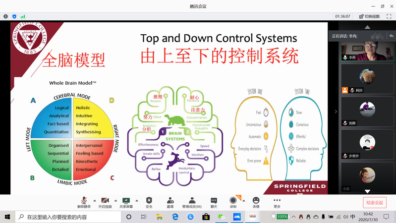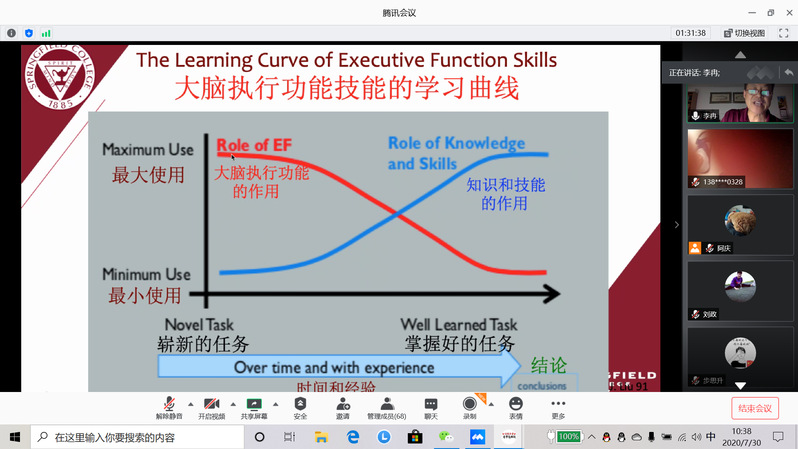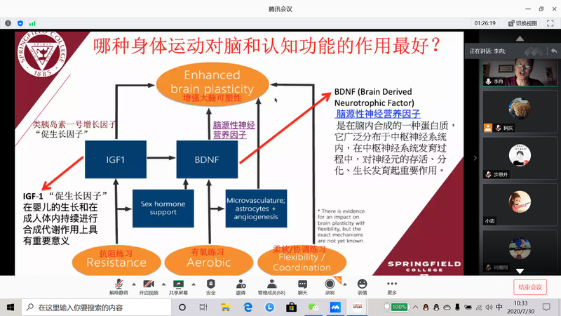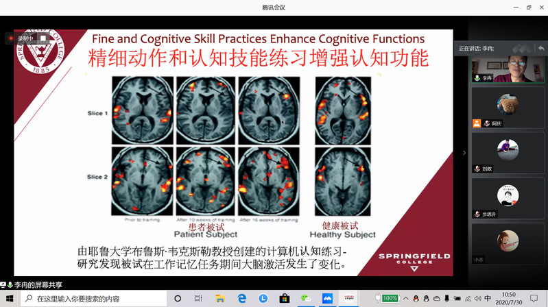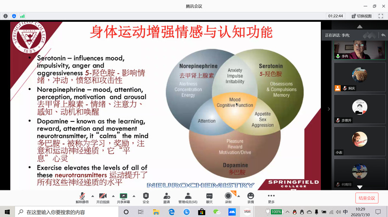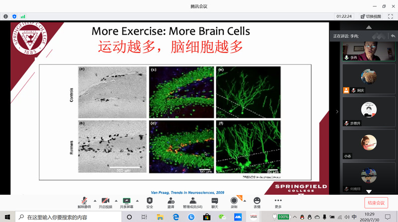 2020731日,应我院邀请,美国春田学院体育健康系终身正教授和博士生导师,美国春田学院霍英东体育运动交流基金项目主任刘展教授在线为我院作了题为《身体运动对脑健康和认知功能的促进研究》的学术报告。报告会由院长胡好主持,学院50余名师生在线收听了报告。