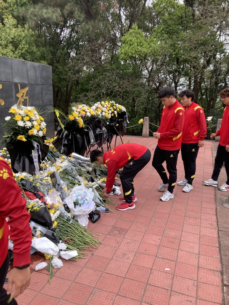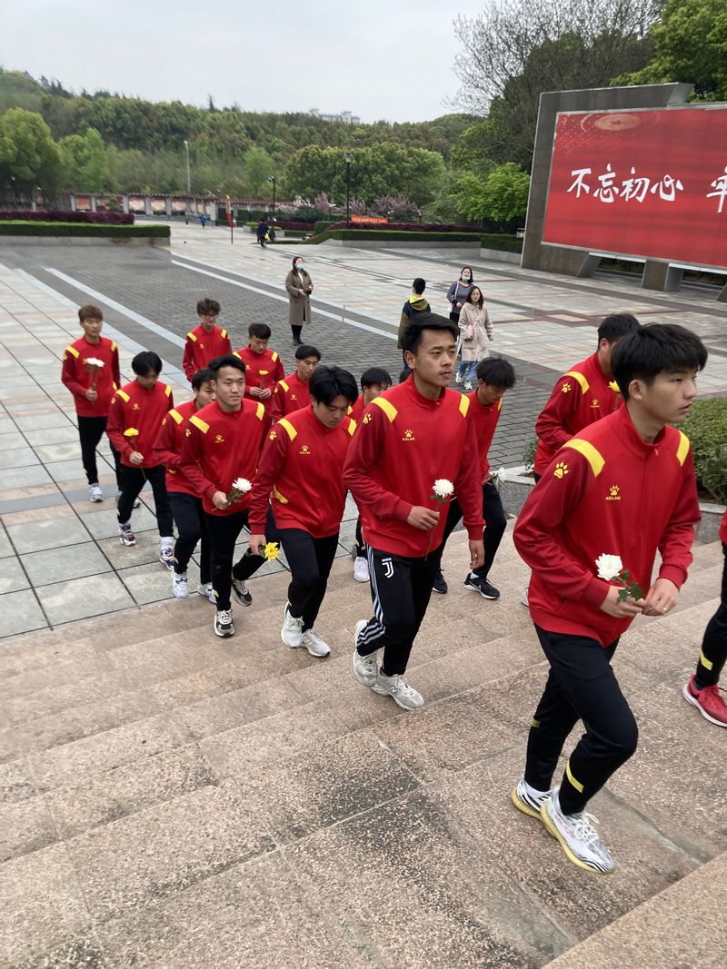 缅怀仪式结束后,全体队员在教练的带领下围绕雕塑公园进行了5公里的体能拉练,随后统一回到足球场继续进行技战术训练。