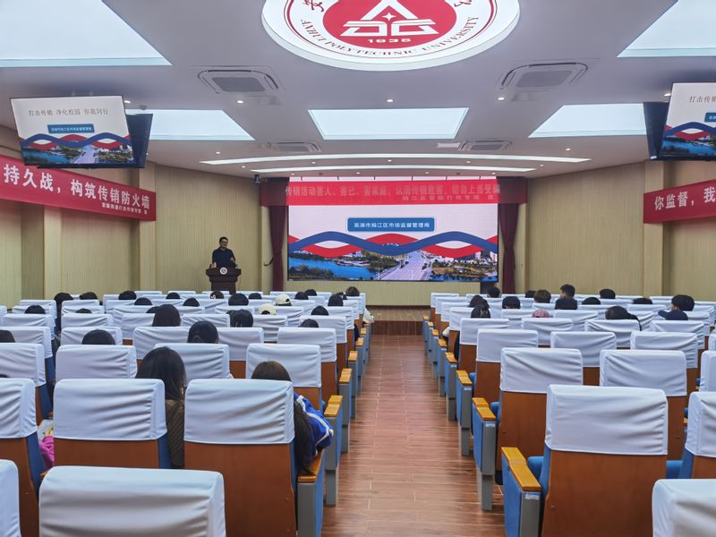 会议伊始,芜湖市鸠江区市场监督管理局的工作人员为同学们介绍了传销的常见形式和相关防范知识常识。宣讲人员以通俗易懂的语言和典型案例,揭露传销的真面目,提示风险危害,向同学们传递预防传销的重要性和误入圈套时的应对方法。呼吁同学们要提高识别、防范传销组织的意识,勇于维护自身安全与合法权益。重点对“传销”与“直销”的区别,从合法性、招募人员、培训等方面说明了二者的本质区别,帮助同学们擦亮眼睛,明辨骗局的奥秘。最后,宣讲员还就电信诈骗的常见形式和防范知识作了简要介绍,并提醒同学们,凡是网上兼职、刷单、刷信誉的就是诈骗;绝大部分想靠传销发财的人都会赔钱失败而告终,切不可存有侥幸心理。