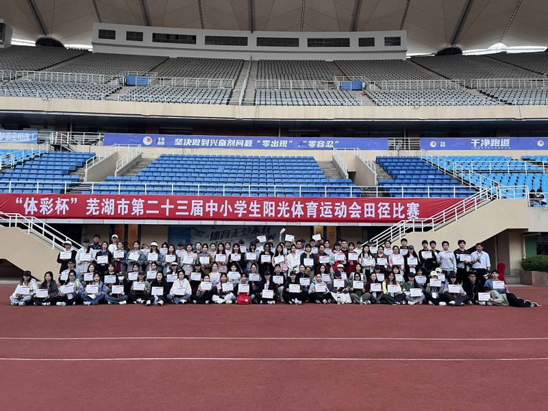 2023年“体彩杯”芜湖市第二十三届中小学生阳光体育运动会田径比赛近日在芜湖市奥体中心体育场举行。我校受邀派出的学生志愿裁判团队以出色表现获得大赛主办单位及参赛学校好评,为本次比赛圆满举行作出突出贡献,展现了学校“三全六专”实践育人的良好成效。