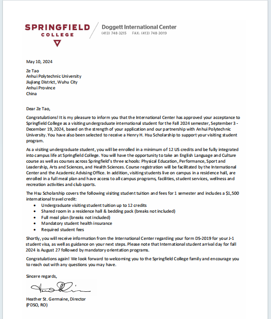 春田学院(SPRINGFIELD  COLLEGE)位于美国马萨诸塞州,创办于1885年,是一所历史悠久并以培养体育人才而著称的高校。春田学院始终坚持运动是一种教育手段,可以帮助学生全面发展的理念,其球类运动(特别是篮球和排球)专业、运动医学和运动心理学等在美国乃至世界都享有很高的声誉。其优秀的教育资源和学术氛围,吸引了世界各地的优秀学子交流学习。陶泽同学在此次交换生面试过程中展现出了扎实的专业知识、流利的英语表达能力以及良好的综合素质,给评委老师们留下了深刻的印象。在得知获得Henry H. Hsu国际全额奖学金后,表示将倍加珍惜这个难得的学习机会,努力提高学术水平和个人综合素质。