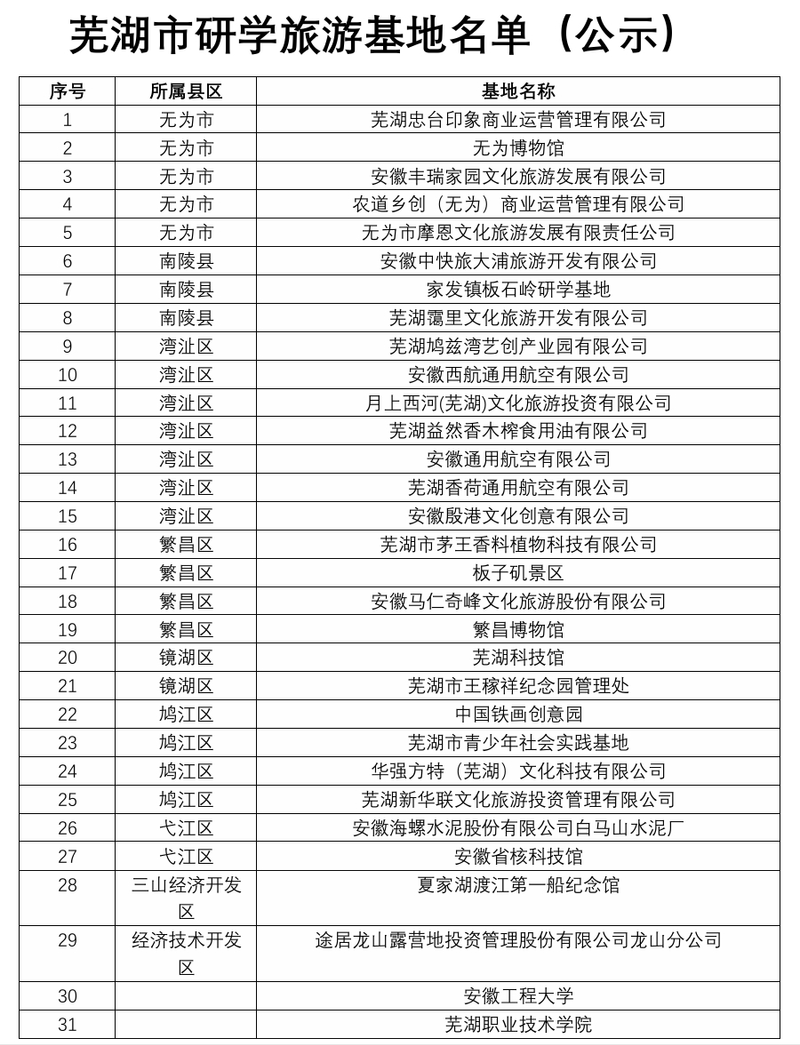近日,市文化和旅游局、市教育局发文公布芜湖市首批研学旅游基地评选结果,由体育学院体验产业学院依托营地和体验教育资源以及在研学教育方面的成果申报的基地项目成功入选芜湖市首批31个市级研学旅游基地,这也是在芜湖唯一入选的本科高校。