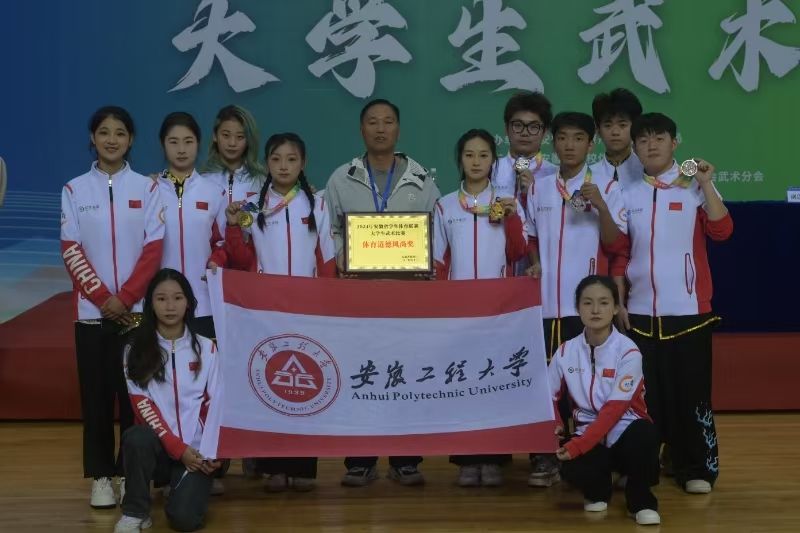 近日,由安徽省教育厅、安徽省体育局主办的2024年安徽省学生体育联赛大学生武术比赛在阜阳师范大学体育中心举行。本次比赛共有来自全省42所高校共355名运动员参赛。经过3天的激烈角逐,我校武术队以优异的成绩顺利完赛、载誉归来。共斩获2金、2银、1铜和7项第四名、多项前八名以及集体项目第二名的佳绩,并荣获“体育道德风尚奖代表队”等荣誉称号。