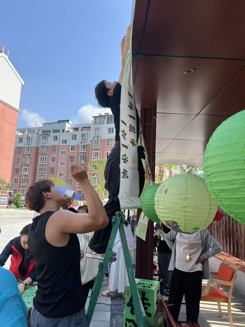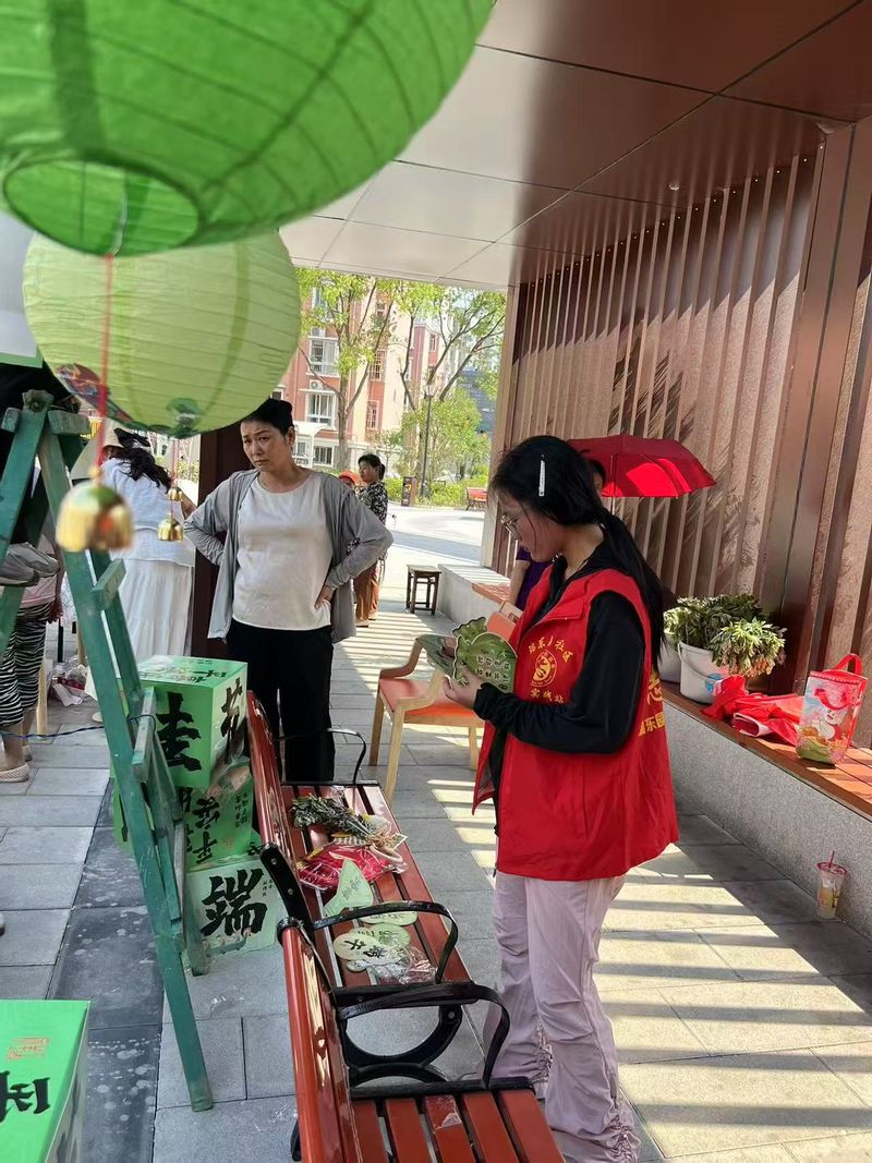 活动当天,志愿者们早早抵达瑞东园社区,迅速投身于社区活动中心端午氛围营造工作中。书法特长的同学挥毫泼墨,一幅幅饱含祝福的条幅跃然纸上;心灵手巧的学子精心摆放艾草香囊,将五彩绳编织成的绿色灯笼错落悬挂。在同学们和社区工作人员的共同努力下,社区活动中心处处洋溢着浓郁的端午气息,传统节日的氛围感扑面而来。