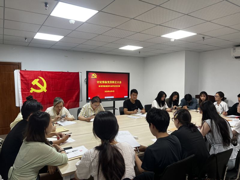 6月9日下午,体育学院表演专业学生党支部在体院413会议室召开党员大会,讨论黄贤赫等6位同志按期转为中共正式党员事宜。会议由党支部书记范同军主持,全体党员参加会议。