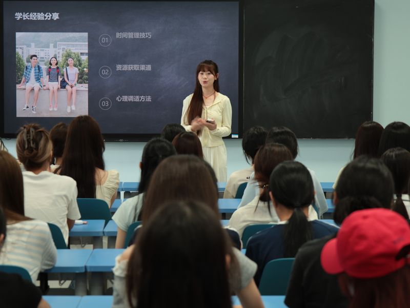 会后,表演231班徐娜受邀分享学习经验。徐娜结合自身经历,生动讲述了如何在繁忙学业、高强度训练和学生干部事务中找到平衡点。她还特别强调了团队合作的重要性,鼓励新生们在军训期间主动沟通、相互支持,为今后的学习和生活打下坚实的基础。徐娜以轻松幽默的方式回答了同学们提出的问题,现场气氛活跃,掌声不断。
