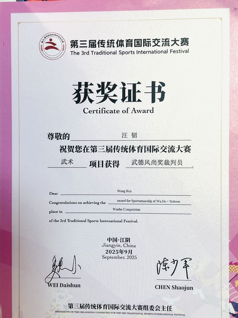 近年来,体育学院持续加强师资队伍建设,积极鼓励教师参与国内外高水平赛事执裁工作,不断提升专业实践能力和行业影响力。汪韧老师的此次参与,不仅展现了我院教师在传统体育领域的专业水平,也为推动中华传统体育的国际传播与交流作出了积极贡献。