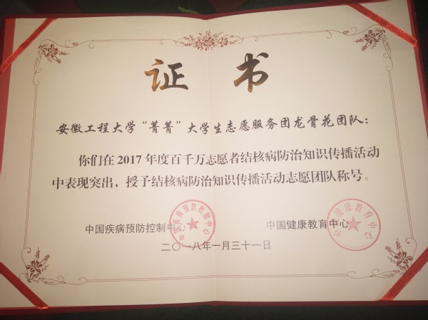 2月1日,2018年全国结核病防治工作会议在北京飞天大厦顺利举行。会上为2017年度百千万志愿者结核病防治知识传播活动的组织保障突出机构、优秀志愿者团队和个颁发了荣誉证书。我校“菁菁”大学生志愿服务团龙骨花团队获得2017年度全国优秀团队,团队核心成员刘谆缘与刘海峰受邀参加了此次会议。