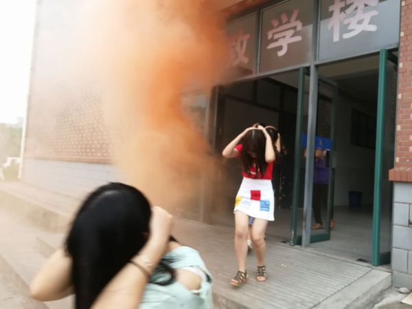 接着,谈丽华宣布演练正式开始。随着哨声的响起,全体学生和院学生会工作人员立即进入应急状态。同学们迅速抱头,躲在各自的课桌下,30秒警报哨声结束,同学们在保卫处及学院老师和学生会同学的组织引导下,分成两路纵队,在燃烧弹形成的烟雾下同学们尽量将身体放低,捂住口鼻按照应急逃生路线迅速而有序地撤离到教学楼下面的空地。整个演练过程既紧张、激烈,又有条不紊。从警报响起到宣布地震演练结束,整个演练仅用时1分55秒。