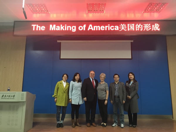 1024日下午,美国波士顿大学詹姆斯·华莱士(James Wallace)教授应外国学院特邀请在5117做了“美国的形成”(The Making of America)的精彩讲座。讲座由外院学院张凤梅老师主持,副院长黄焰结、英语系主任李新国以及部分师生参加了讲座。