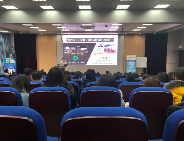 我院2005级毕业生周婷婷作为“海派乐青少儿英语”公司的代表首先向毕业生做了招聘宣讲。她逐一介绍了公司核心价值观、教学步骤、教学对象以及本次招聘岗位的具体要求等,通过与现场毕业生的互动为本场招聘会开了一个好头。接着,安徽智达冈山信息科技有限公司进行宣讲,作为一家日企公司,招聘代表向学生分享了独特的日企文化。中日双语结合的宣讲生动活泼,充分调动了学生的热情。随后芜湖外服语培中心、安徽新国壹教育咨询有限公司、芜湖中瑞集团股份有限公司依次做了招聘宣讲。