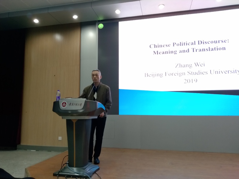 2019年3月20日晚,北京外国语大学张威教授受邀来我校进行题为“中国政治外交话语术语的解读 (Chinese Political Discourse:Meaning and Translation)”的学术讲座,讲座由外国语学院院长黄焰结主持。英语专业高年级同学和部分教师、研究生聆听了讲座。