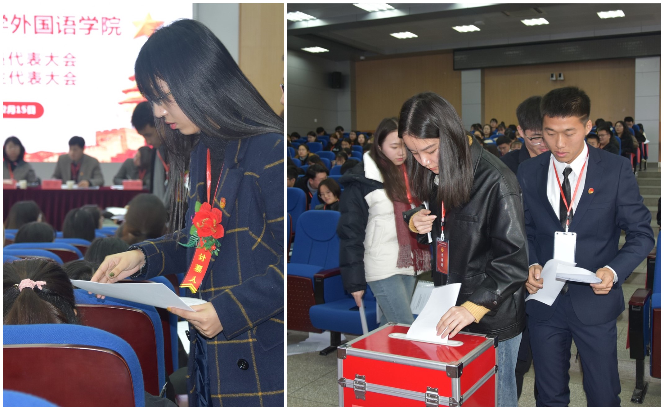 12月15日,外国语学院第二次团员代表大会暨第三次学生代表大会在5教117隆重召开,校团委副书记黎新宏、学院党委书记朱尚玉、学院党委副书记李校林、学院团委副书记张雅静、校学生会副主席杨光宇以及学院102名团员代表、101名学生代表共同参加了本次大会。