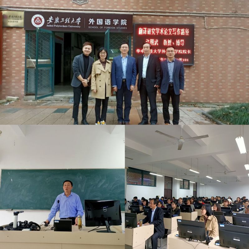 许明武为师生们做了“翻译研究学术论文写作路径”的学术报告。基于历年自身论文写作与发表真实情况,从论文写作选题、论证、研究侧重点、注意事项等方面进行了较为详细的说明,分别针对CSSCI与中文类核心期刊论文写作与发表和SSCI、A&HCI论文写作与发表,结合具体实例分析探讨了论文写作与发表路径,归纳总结了科研素质与论文写作之间的关系,对外语教师从事科学研究提出了宝贵建议。讲座翔实、具体、信息量大,所用数据和实例全部为自己的学术论文,具有极强的说服力。许明武风趣的演讲、渊博的学识、良好的学术素养和谦虚严谨的学者风范让与会者肃然起敬,大家纷纷表示受益匪浅。会后他与参会教师进行了互动,解答了大家在翻译研究、论文发表中遇到的一些困惑。