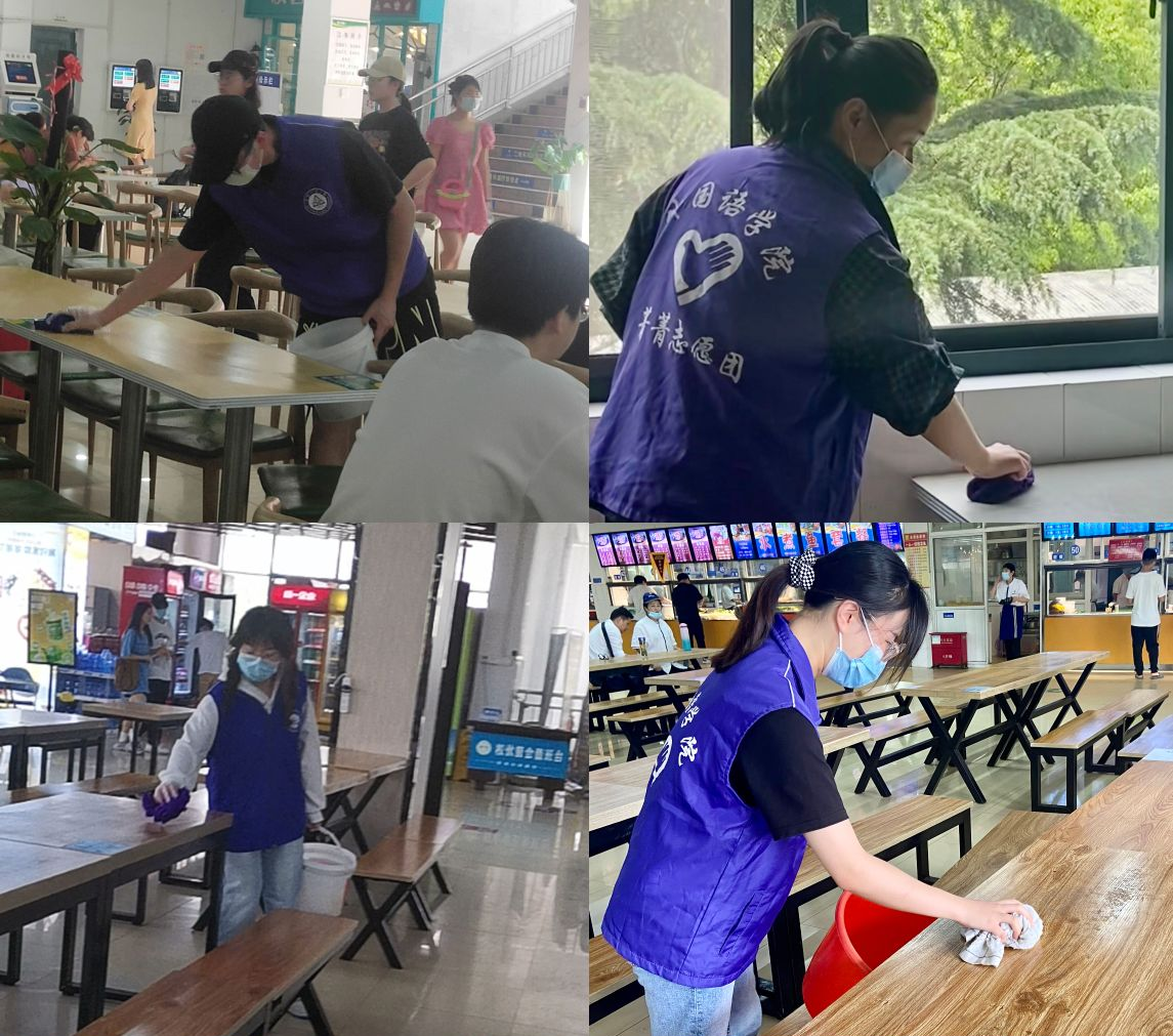 各小组分工明确,按时到达指定地点,井然有序地开展活动。在图书馆,志愿者们把读者还回的图书按类推到不同的楼层,分类排序,依次上架;6教教室,志愿者们擦去黑板上的字迹、抹去讲台上的灰尘并清理掉课桌桌肚中的垃圾;在女生1栋和7栋宿舍楼,志愿者们将楼道里的垃圾集中起来,运送到楼外的垃圾箱;在三、四食堂,志愿者们一手拿着抹布,一手提着水桶,及时清理掉油腻的餐桌垃圾;在校园内,志愿者们按顺序合理摆放共享单车和电动车,方便路人行走。天气炎热,汗水浸透了志愿者们的衣服,但他们洋溢着青春气息的脸上却有着一丝坚毅和倔强,保质保量地完成各项任务。