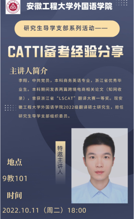 为贯彻落实学校党委“三抓”和“三全六专”育人工作要求,发挥榜样引领和党员示范作用,让学生“学”起来,帮助翻译研究生同学备考CATTI二级,研究生导学支部于10月11日晚举办了CATTI二级备考经验线上分享会。研究生导学支部书记李新国、学院硕点负责人张凤梅老师参加了本次会议。