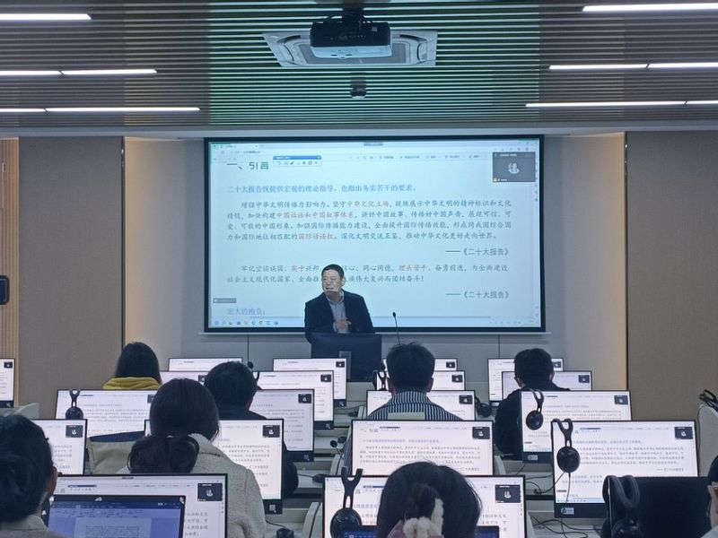11月23日下午,外国语学院研究生导学党支部在9J103举办“导师论坛”,专题宣讲党的二十大精神。刘运锋博士应邀做了“构建中国话语体系,讲好中国故事  二十大报告的语言学思考——中国英语表述中的语义韵冲突分析”的宣讲报告,全体翻译硕士研究生和部分教师线下或线上聆听了报告。报告由学院副院长、研究生导学支部书记李新国主持。