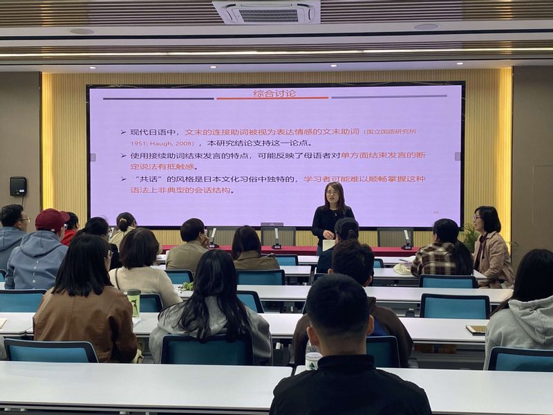 首先,汪敏博士作了题为“日语中间接拒绝理解的神经语言学研究:母语者与学习者的对比分析”的学术报告。汪博士从人际关系交往中间接拒绝的现象和特点出发,提出了开展实证研究探讨母语者和学习者理解间接拒绝现象的心理和神经基础。报告通过采用功能性磁共振成像(fMRI)和事件相关电位(ERP)等神经生理学方法,对日语母语者与日语学习者在处理间接拒绝未完结句时的机制进行了详尽的对比分析,揭示了日语母语者在理解涉及人际关怀表达间接拒绝时的未完结句大脑活动的空间定位,明确了母语者与相对不太熟悉日本语言习惯和文化习俗的日语学习者在处理这种句子时大脑活动的时间序列上的差异化特征。本研究通过被试的神经反应平均值及其个体差异,为人际关系会话风格会根据连续的个体特性发生变化提供了科学证据。然后,在讨论环节,老师们就fMRI和ERP两种实验的偏好以及特色、被试对象的遴选、低心智化能力学习者的研究等问题与汪敏博士进行了深入探讨和交流。
