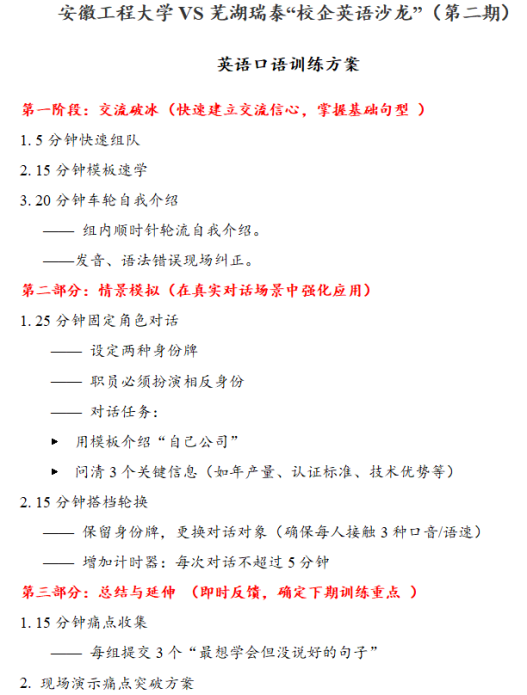 芜湖瑞泰汽车零部件有限公司相关负责人指出,随着公司海外业务的拓展,在技术交流、商务洽谈等方面对员工英语口语能力提出了更高要求。企业期望通过此次校企合作定制的口语训练方案,切实提升员工在实际工作场景中的英语应用水平,突破国际业务交流的语言障碍。外国语学院张兵老师回应表示,高校将充分发挥专业优势,结合企业实际需求,量身打造更具针对性和实用性的口语方案,为企业培养符合国际化发展需求的人才。