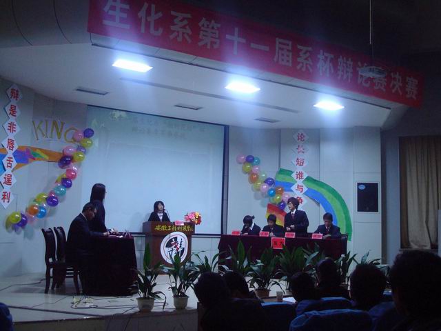 比赛分为两场进行。首场为食品09级和生技代表队就“追求越多是否越幸福”展开激烈辩论。双方辩手准备充分,一辩提纲挈领的立论陈词使辩论赛从一开始就呈现出激烈的交锋状态。在攻辩阶段,双方思维敏捷,反驳有力,赢得了现场观众的阵阵掌声。接下来,由食品08级和生工08级代表队就“科技引领生活还是生活引领科技”展开冠军争夺战。辩手们思维缜密,从各个角度对辩题进行剖析,并用诙谐幽默的语言进行论证。整场比赛高潮迭起,查桂义老师对本场决赛进行了点评,并指出比赛优缺点。最后,食品08级代表队获得比赛冠军,生工08级和食品09级代表队分别获得第二、第三名。
