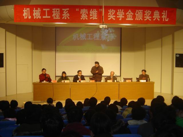 12月20下午4:30,2009年机械工程系“索维”奖学金颁奖典礼在学术报告厅隆重举行。上海索维机电设备公司副总经理朱振宇、上海索维集团行政部经理李燕、机械工程系副主任许德章及项宁、何芝仙、黄炜等老师出席了典礼,典礼由系党总支副书记邓英扣主持。