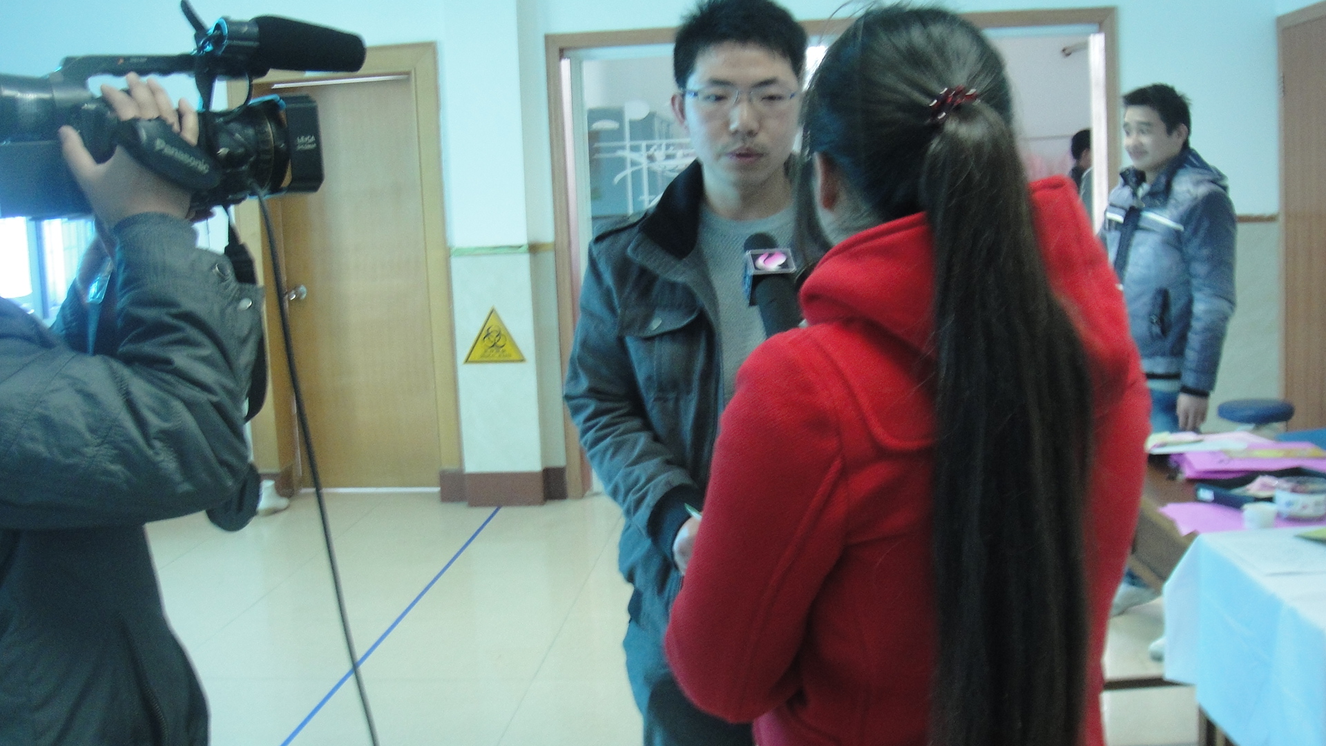 紧急时刻,奋不顾身。3月24日上午,物流专业两个班同学自发组织募捐活动,大家上下同心,在很短的时间里募捐了2100多元钱款,希望能够帮助程明君同学,让她能感受都我们大家和她都在,而不是只身作战。中午1:15,在辅导员的陪同下一行共6人乘火车抵达池州市,并坐上公交直达池州市中心血站,同学们连午饭都没吃,就开始了验血。验血结果直到下午6:05才出结果,三名同学中,只有王雷同学一人符合献血小板的条件。来不及吃晚饭的王雷二话没说,只吃了一碗清汤面就毫无顾虑地脱下棉衣,挽起袖子躺在病床上献血了。池州市电视台记者闻讯后第一时间赶到采血站,他们为这些异地赶来的90后大学生捐献血小板之事所感染,从下午1:30一直到晚上8:50进行了全程跟踪采访。