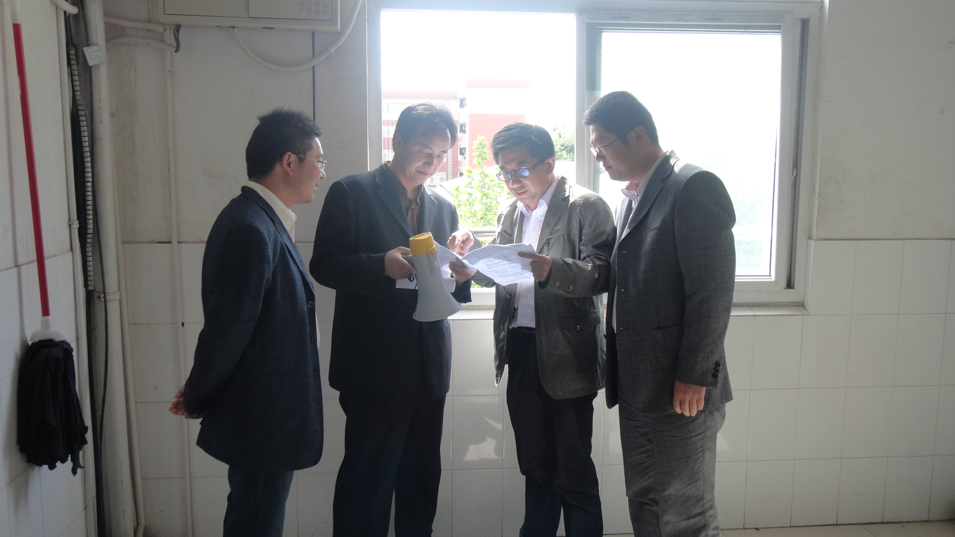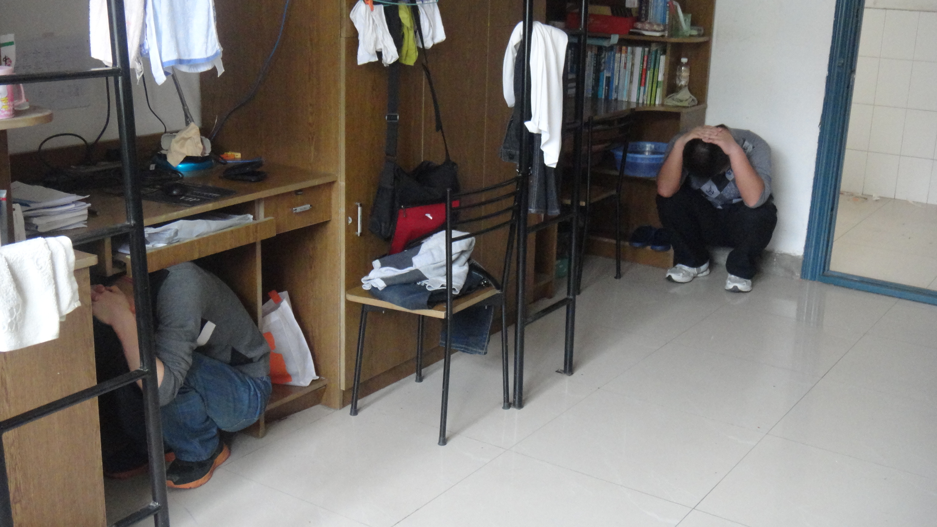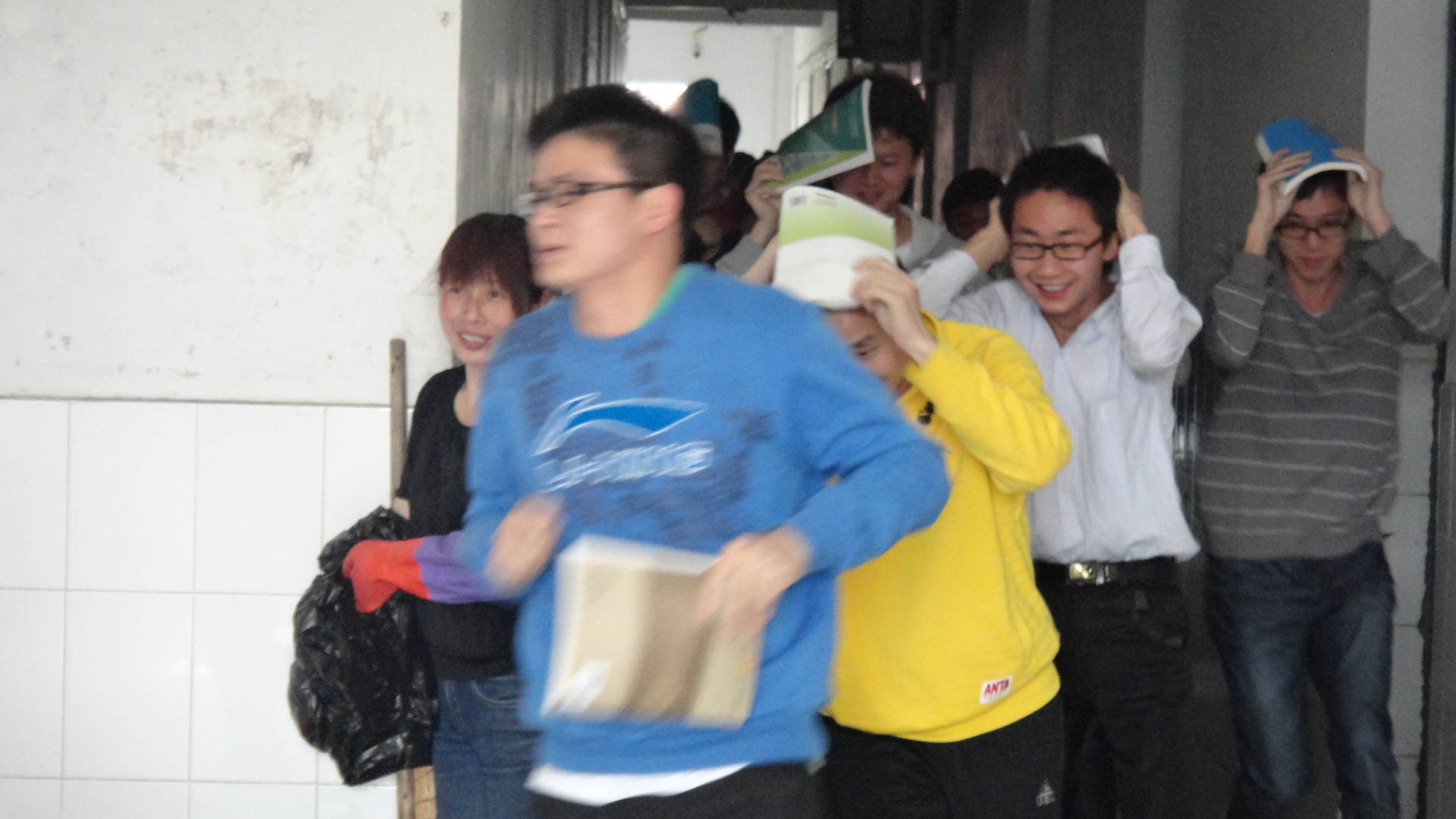 为了做好演练工作,4月24日下午4:30在4J101召开参演学生、工作人员会议,李烨对演练工作进行周密安排。强调演练楼层及疏散通道设警禁区,防止非参演人员进入演练区域,同时组织参演人员认真学习防震减灾知识,熟悉应急避震的正确方法。经过前期精心的准备,整场演练于25日下午3:00准时开始。李烨首先向参与演习的有关人员发布地震信号,同学们反应迅速,秩序井然,采取了积极有效的室内避震方法,选择了支撑性良好的室内设施进行自我保护。30秒后,随着震后疏散指令,参演人员迅速进入震后紧急疏散阶段,采取保护措施,将书本等物品顶在头上以保护头部,并迅速离开宿舍楼。整个疏散过程用时极短,并且井然有序,所有人员均安全撤离。最后在李烨书记的指导下,同学们在男生1栋和2栋宿舍之间的空地整理好队形,前往土操场进行消防演练。