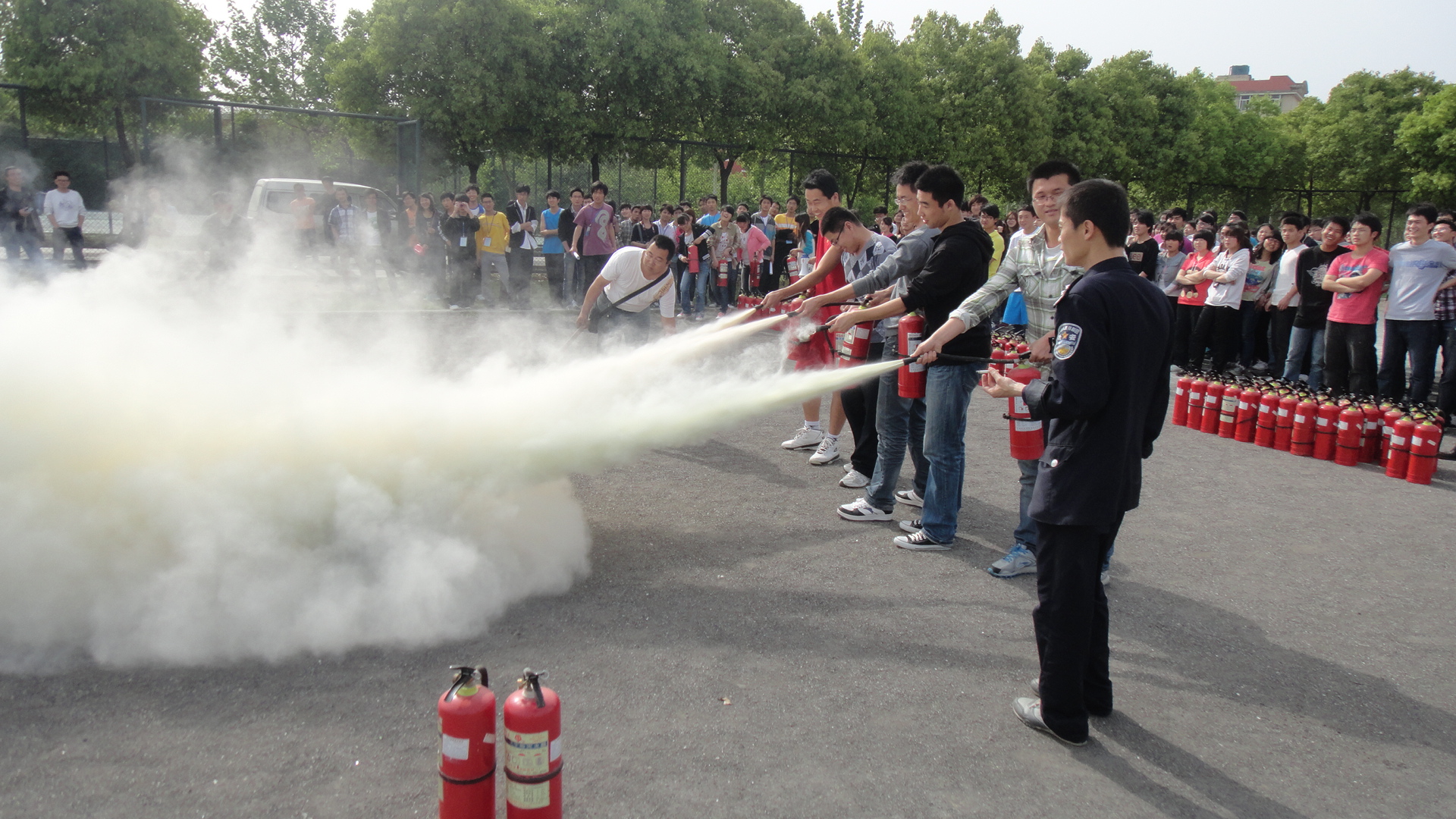 消防演练在校保卫处的指导下有序进行。校保卫科的工作人员首先向参与演练的同学们耐心细致的讲解了消防龙头和干粉式灭火器的正确使用方法。随后,同学们以5人为一小组,亲手操作了干粉式灭火器,对模拟明火进行了扑灭。