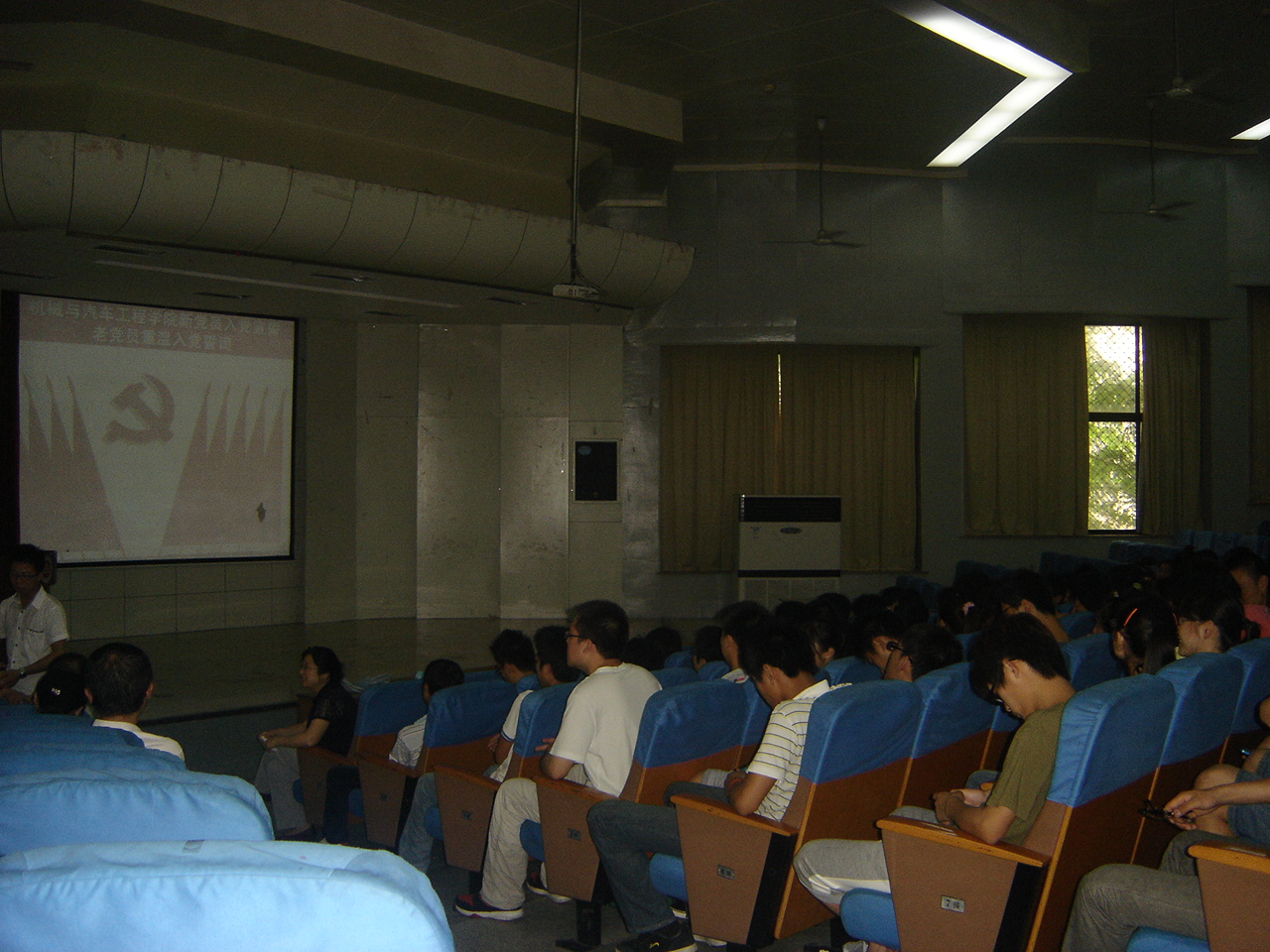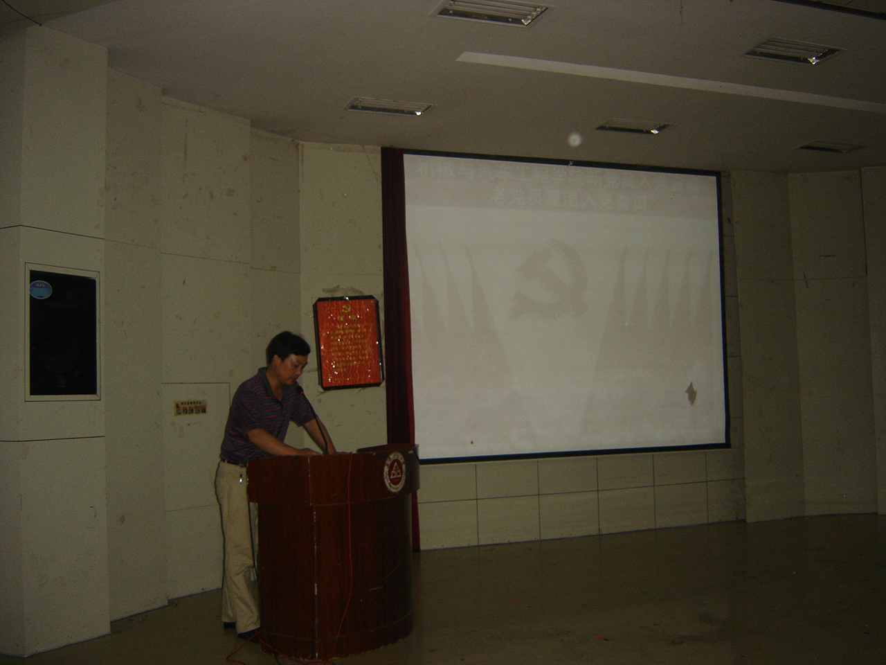 庄严的国际歌拉开了会议的序幕。首先,周怡宣布大会开始,并带领预备党员、正式党员宣读和重温入党誓词。一百多名党员有序地报出自己宣誓人的名字,铿锵有力的声音下跳动着一颗颗对党热衷而赤诚的心。然后,邓英扣作了题为“创先争优,保持党的纯洁性,迎接党的十八大”的讲话。在对新加入党组织的预备党员表示祝贺后,他带领全体同学一起回顾了党的历史、党的成就以及近年来党的建设与发展,肯定了党的先进性。紧接着,分别从“创先争优,积极发挥‘五带头’作用”、“锐意进取,全面发展,当好社会主义事业的建设者和接班人”两方面阐述了作为学生党员应培养和具备的素质,通过理论联系实际的论述方式,对当下大学生之间出现的不正当思想进行了纠正,激励了同学们争当优秀党员的决心。最后,周怡宣布会议结束。
