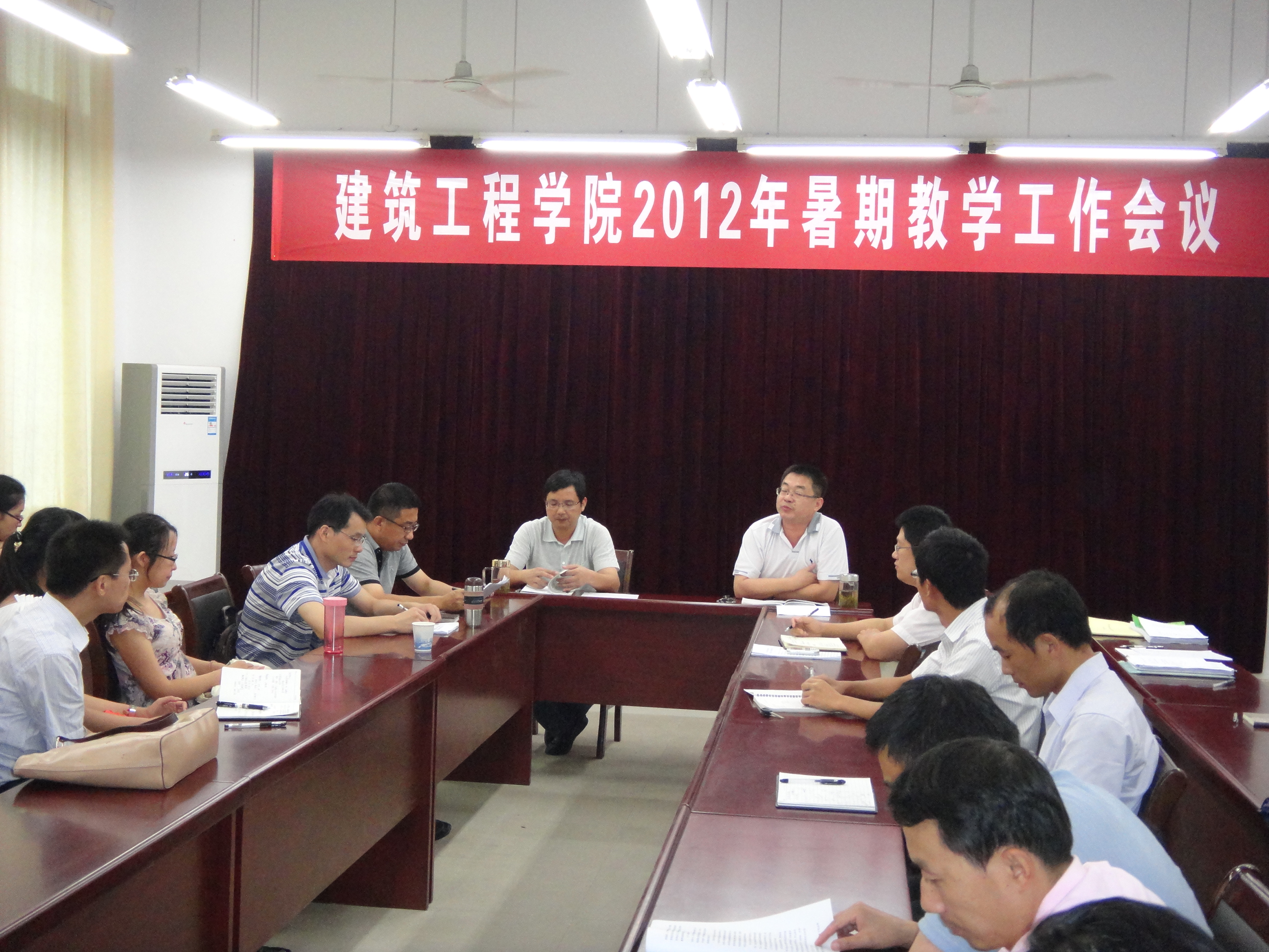 为贯彻落实2012年安徽省高校教学工作会议和学校2012年暑期教学工作会议精神,829日,建筑工程学院组织召开2012年学院暑期教学工作会议。会议主题是:认真贯彻落实学校教学工作会议精神,全面提升高素质应用型人才培养质量。校长干洪、教务处处长陶庭先应邀出席,党总支书记徐达奇、院长陆峰、院党总支副书记李烨和全体教职工参加会议,会议由李烨主持。