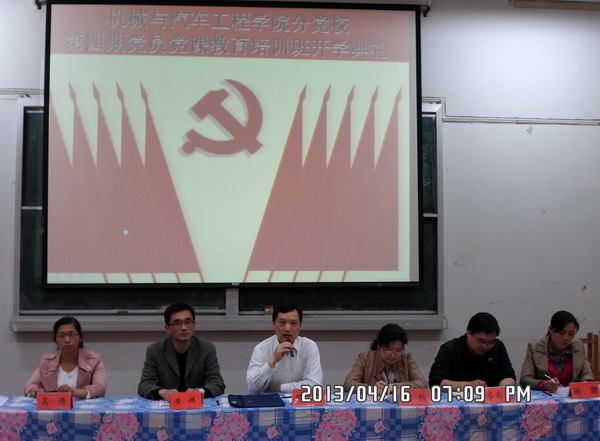 4月16日晚上,机械与汽车工程学院第四期党员党课教育培训班开学典礼在二教报告厅隆重举行。学院党委书记、分党校校长邓英扣,党委副书记、分党校副校长周怡,院党委委员、团委书记黄炜,学生支部书记齐尚晓、高倩、孙霞等出席开学典礼。典礼由周怡主持。 晚上7时,开学典礼在庄严的国歌声中拉开序幕。首先,黄炜宣读了《机械与汽车工程学院关于第四期党员党课教育培训班开学的通知》。接着,邓英扣作了发言,他向参加本期培训班学习的全体学员表示热烈祝贺,并以“作为一名中共预备党员,如何才能完成使命?”为主题,从认真学习和深刻领会党章,做合格的共产党员;认真学习并践行社会主义核心价值体系,发挥先锋模范作用;勤奋学习、努力工作,实现中国梦等三个方面展开分析,希望广大学员能够通过培训,不仅使思想觉悟进一步得到升华,更能够结合实际情况,实现“学校发展梦”和“个人成才梦”有机结合,最终实现党的最高理想和最高目标。 随后,学员代表康马杰同学发言。他庄重的表示,作为一名中共预备党员,一定会正确认识本次培训的目标和意义,并号召全体学员在培训过程中认真学习党的理论知识,加强党性修养,严格要求自己,积极实践,在党组织的帮助和监督下,以优异的成绩来向党和人民进行汇报,努力做一名合格的共产党员。 最后,开学典礼在铿锵激昂的国际歌中落下帷幕。