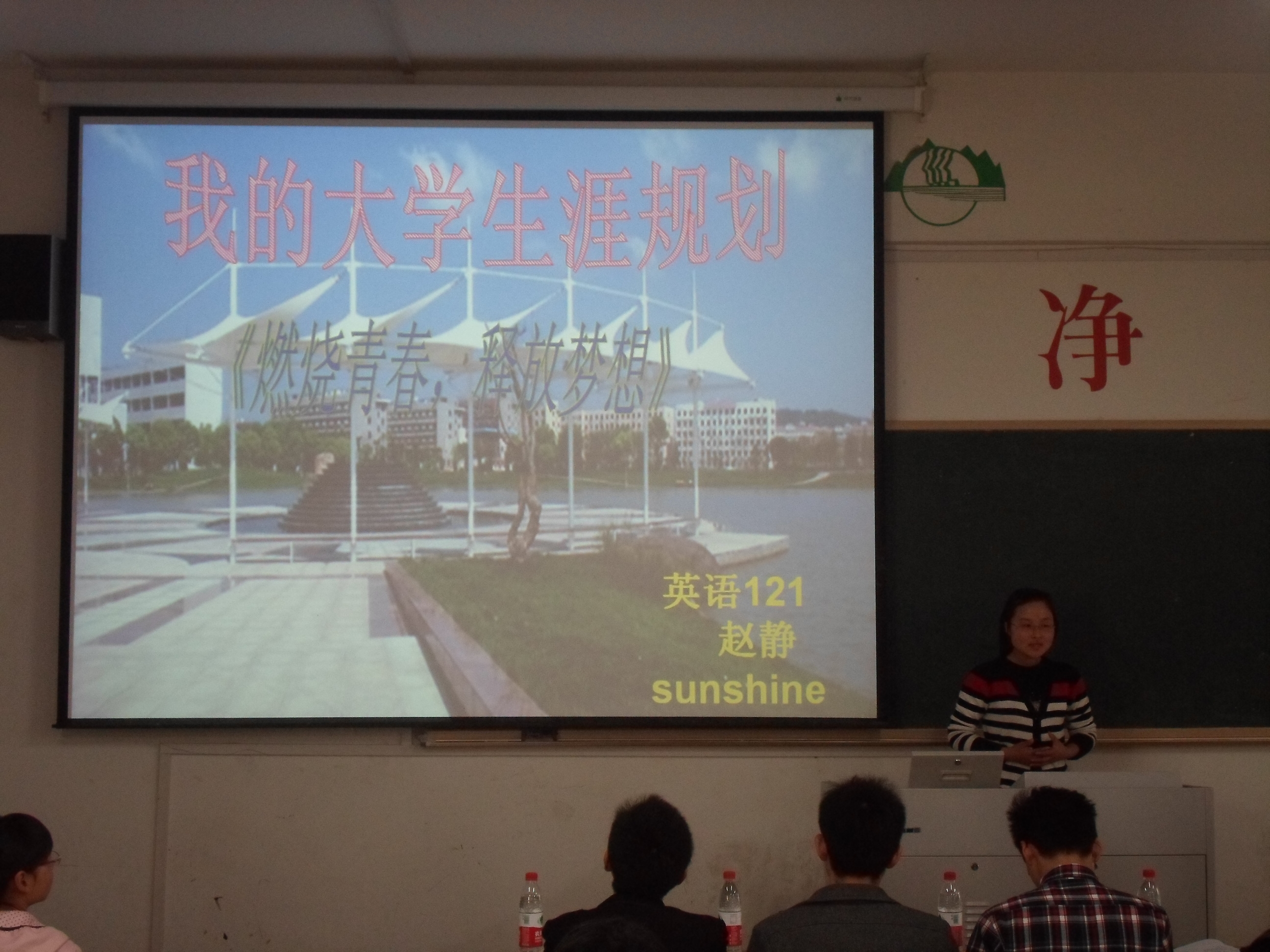 大学生涯规划大赛为外国语学院的品牌活动,旨在帮助大一新生完成角色转变,更有意义地度过大学生活。大赛分为学习交流、设计规划和总结评比三个阶段。第一阶段,由院党总支副书记谈丽华和校友,为2012级学生进行了“坚持梦想,打造人生财富力”和“舞动青春,梦想与规划同行”两场讲座和经验交流;第二阶段,由每位同学根据自身特点,设计出《大学生涯规划书》和PPT汇报稿;经过评选,产生出10位同学进入第三阶段的最后决赛。本次大赛历时近一个月,不仅为同学提供了一个全面展示大学规划的舞台,也让同学们的目标定位更加准确,为以后成就梦想奠定了坚实的基础。