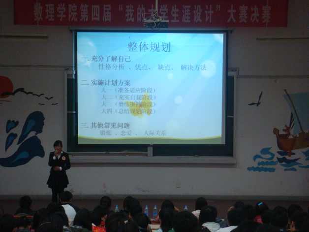 11月2日,数理学院第四届“我的大学生涯设计”大赛决赛在2J报告厅举办。学院党委书记张开炳、党委副书记水心宝、团委副书记郭亚勤、辅导员刘文震以及各兄弟学院学习部部长观看了比赛。担任本次比赛的评委是在校“我的大学生涯设计”比赛中获奖的选手,最终评出一等奖两名,二等奖四名,三等奖六名。