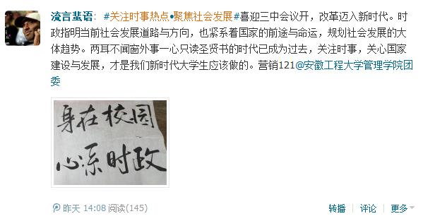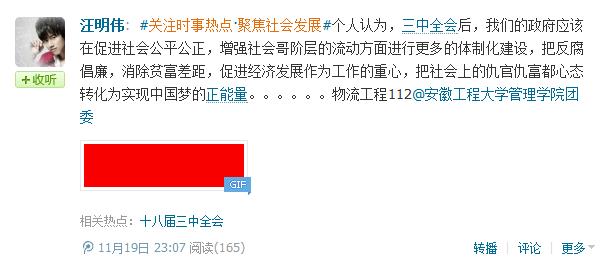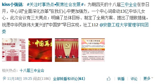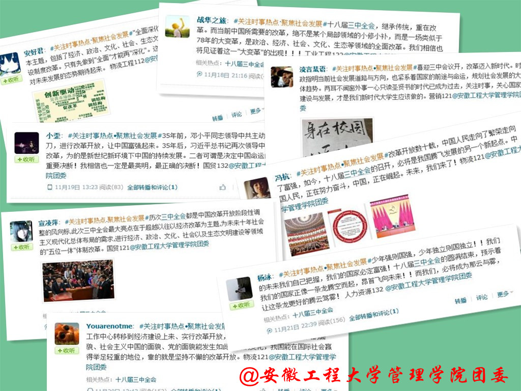 此次微博大赛受到了学校相关班级团支部和个人的广泛关注,网友充分结合十八届三中全会精神,联系自身实际和社会发展,各抒己见。社工112班网友“kiss小强锅”说:“为期四天的十八届三中全会在京召开,中心词‘全面深化改革’在我们心中更加强烈,一个中心词牵动13亿中华儿女心。此次会议有三大亮点:明确了总体目标、制定了全局方案、提出了细致措施。祝愿中华民族伟大复兴的‘中国梦’早日实现。”;营销121班“流言蜚语”网友在微博中如此写道:“‘两耳不闻窗外事,一心只读圣贤书’的时代已成为过去,关注时事,关心国家建设与发展,才是我们新时代大学生应该做的。”