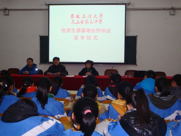 124,我校招办一行首先来到了有着八十多年校史的安徽省明光中学,受到该校校长等热情接待,双方洽淡了合作共建事宜。接着,我校和明光中学举行了“优质生源基地”授牌仪式,签署了合作协议;学校数理学院王传玉教授面向明光中学数学教师和部分高三学生作了“数学建模竞赛”知识讲座,他深入浅出的讲授,受到了中学老师和同学们的普遍欢迎。