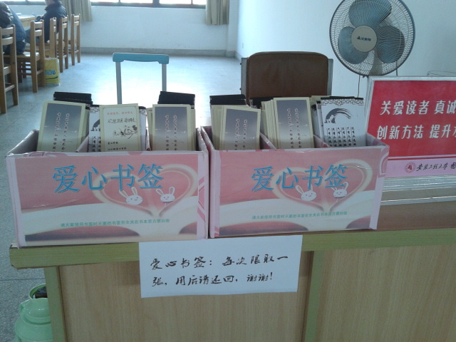1214,我校人文学院法学101班刘丽丹和机电学院营销2012班周子昊两位同学共同向学校东图书馆捐赠1000枚爱心书签。