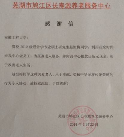 学雷锋不是一句口号,也不是一种形式,而是要做实事,在我们身边就有很多这样的雷锋榜样。艺术学院2012级研究生赵恒梅同学乐于助人、无私奉献。她利用业余时间经常去芜湖市鸠江区长寿源养老服务中心献爱心,义务帮助工作人员打扫卫生,为行动不便的孤寡老人叠被、洗澡、梳头等。322,她还向该中心捐款伍佰元整,用于改善这里孤寡老人的生活。她的一系列行为受到了该中心全体人员的一致好评,该中心为表感谢,向我校寄来了感谢信。这是我们学习的榜样,我们也应该像赵恒梅一样,做一个有爱心,有责任心的人,将雷锋的精神实践于我们日常的生活中。