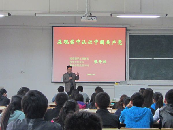 本次党课的主题是“在现实生活中认识中国共产党”。张开炳以“怎么认识中国共产党?你们眼中的共产党是什么样的?”提问的方式引入主题。学员的感想不尽相同,给出的答案多种多样,但对党饱含的真挚感情却如出一辙。张开炳就同学们的回答,分别从中国共产党的性质、指导思想和中国共产党的历史和现实作用等方面,结合自己工作学习生活中的认识和感悟讲述了自己的见解。他提出全面正确认识中国共产党,既要有以马克思主义哲学和辩证唯物主义、历史唯物主义为思想基础的理性思考,也要有面对社会现实的感性认识。他鼓励入党积极分子努力加强学习,要发挥自己善于学习的强项,在大学阶段要力争在学业上有更好的发展;要在认真学习党的基础知识的同时,注重在学习生活实际中加深对党的认识,加强自身修养和党性锻炼。