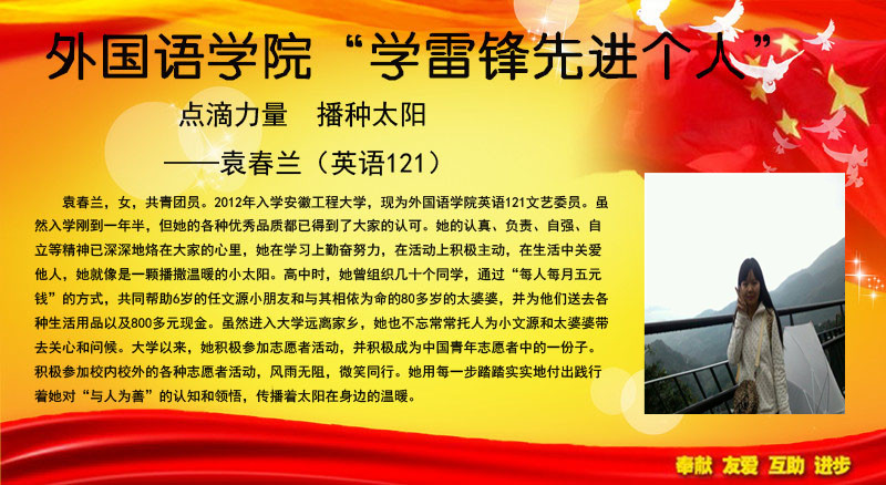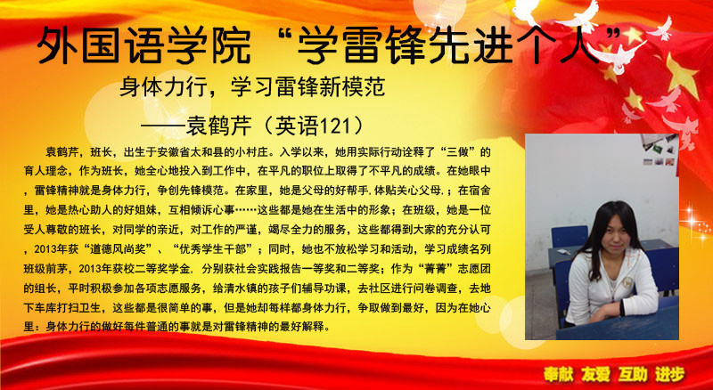 为表彰“学雷锋先进个人”,现将他们的事迹进行展示。希望广大同学能学习他们身上闪光的点点滴滴,并通过向他们学习,带动周边更多同学学雷锋,使雷锋精神成为一种时代的精神风貌,让雷锋精神永远传承下去,成为中华民族的精神财富。