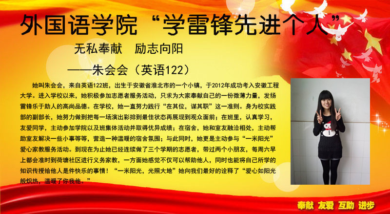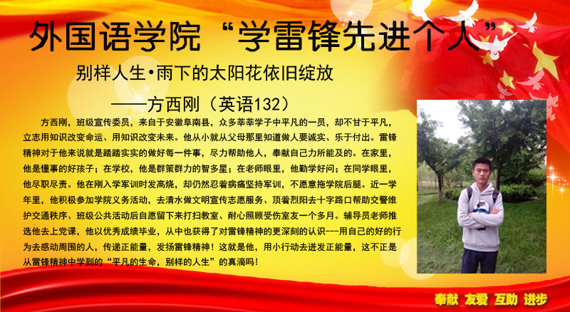 外国语学院自3月份开展“团百花”学雷锋志愿服务活动以来,各班级、各团支部积极组织、开展活动,志愿服务活动已渗透进生活的方方面面,在学生身边也涌现出许多活雷锋,体现了年轻大学生新时代的精神风貌。为更好地弘扬雷锋精神,经同学们的推选,发掘了一批真实、鲜活、感人的雷锋式人物和事例。他们就是我们熟悉的同学,生活中平凡的“小人物”,是他们用自己的一言一行给我们带来了“大感动”,是我们学习的标兵。