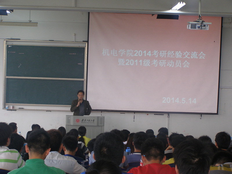 “宝剑锋从磨砺出,梅花香自苦寒来”。为进一步做好考研指导,分享考研心得,传授考研经验,增强考研信心,机电学院于514日下午5教217教室召开2014年考研经验交流暨2011级学生考研动员大会。校研究生部张亮亮,机电学院党委副书记郭全根,辅导员居洋、仵广海、范同军及2010级考取硕士研究生的7位优秀学生代表与2011级准备考研的同学参加了会议。