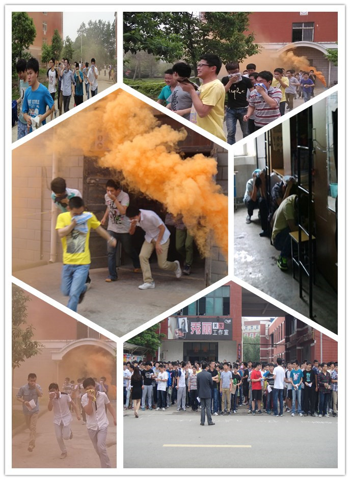 本次应急疏散演练选在男生11栋宿舍举行,参演学生共有300人。随着现场指挥宣布:“地震应急疏散演练开始,现在地震来袭,紧急避震”,所有安全员打开寝室大门,喊话“地震了,不要慌,快避震”,并提醒学生就近躲避在课桌下、承重墙墙根、墙角。30秒后,现场指挥喊话:“现在地震暂停,发现火情,立即疏散”。安全员随即带领同学们用毛巾捂住口鼻迅速、有序地向各楼层楼梯口疏散,快速撤离宿舍楼到达安全区域,各班清点人数后,由辅导员带领学生撤离。防震应急疏散演练结束后,同学们在校保卫处老师的指导下参加了灭火实战演练。