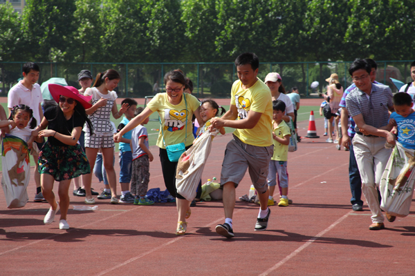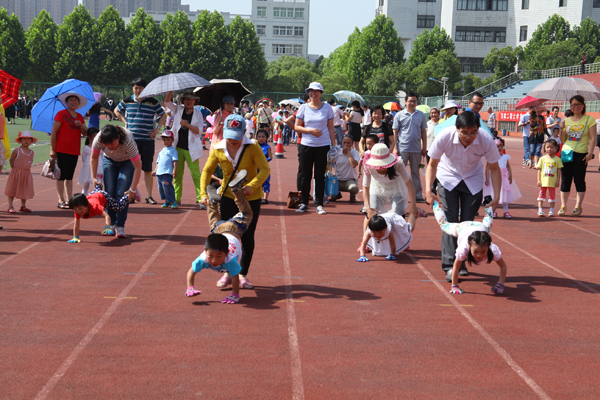 亲子运动会现场,孩子们和爸爸、妈妈一起参加了《娃娃过河》、《袋鼠接力》、《推小车》、《托球跑》、《三人四足》、《毛毛虫》等六个充满童心童趣的亲子游戏比赛。小小运动员们天真、精彩的表现和爸爸妈妈洋溢在脸上的重温童乐的喜悦相映成趣,呐喊声、欢呼声此起彼伏,充满了运动场的每一个角落。