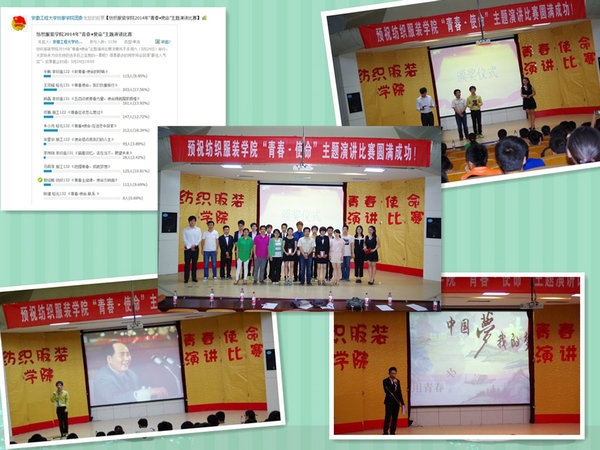 为深入学习贯彻习近平总书记五四重要讲话精神,引领青年学生自觉承担时代赋予青年的历史使命, 5月27日晚,纺织服装学院在学术报告厅举行了“青春•使命”主题演讲比赛决赛。院党委副书记孙宏义、院团委书记以及全体辅导员观看了比赛。