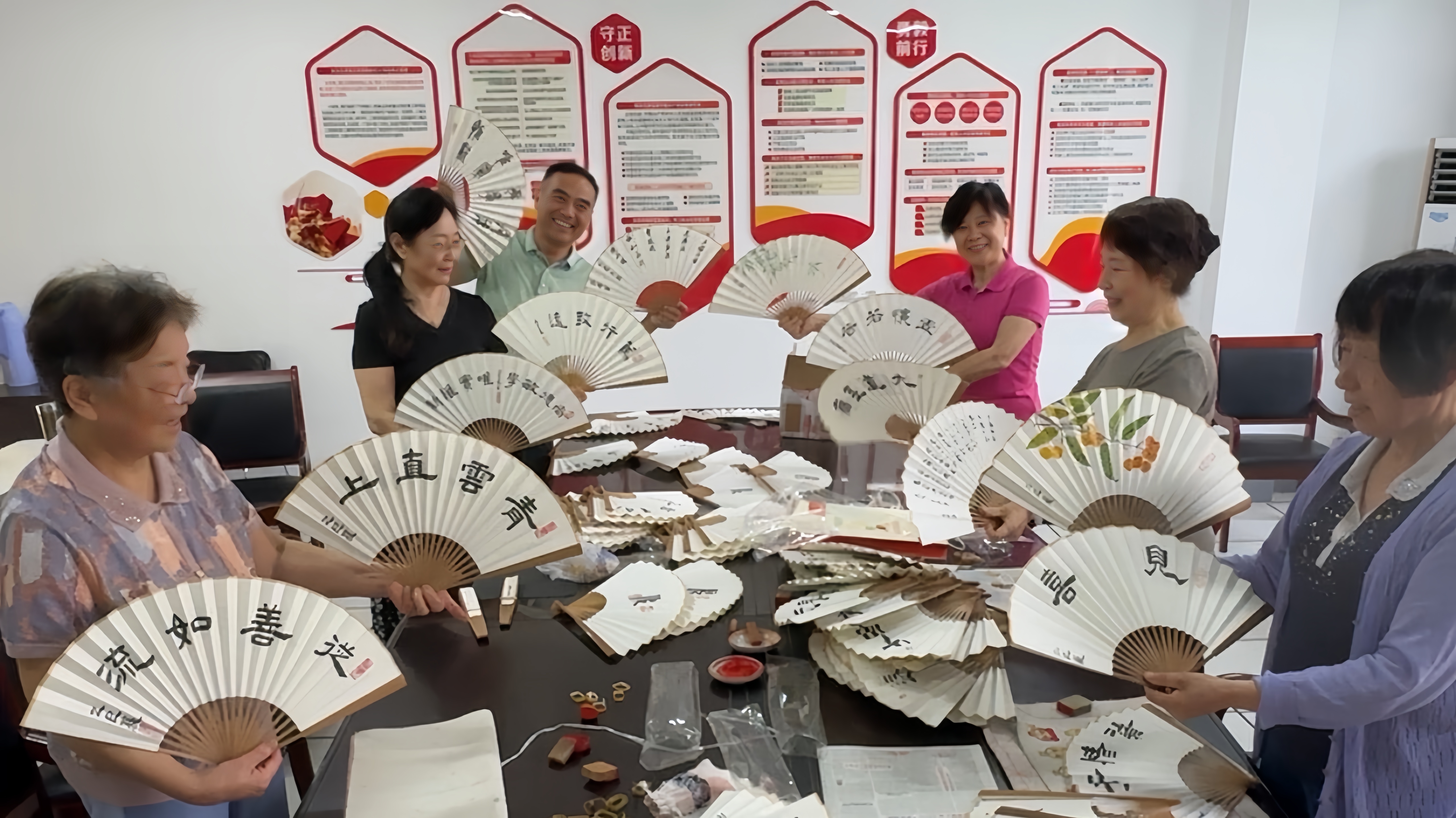 6位退休老教师在160多把折扇扇面上精心绘制书法和国画,还篆刻了专门印章,校训、大学精神、自创诗词……每一幅扇面都是独一无二的艺术品,倾注了退休老教师对同学们浓浓的爱,表达了退休老教师对毕业生满满的祝福。周毅仁老师介绍说,他们从筹划项目到创作扇面、制作纸扇、完成作品,用了数天的时间,但内心一直满怀着激动与深情,很多老教师闻讯都来帮忙,加入项目制作当中。