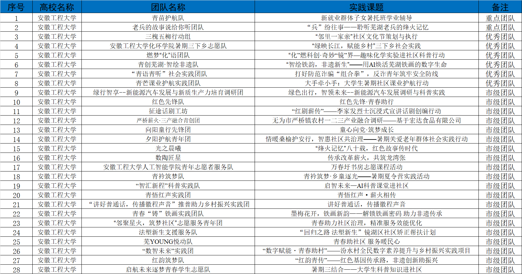 本网讯 近日,2025年芜湖市“芜聚青春 共创未来”大学生社会实践项目评选结果发布,我校获批立项项目28项,其中,2个项目获评“重点团队”,6个项目荣获“优秀团队”,20个项目被确立为“市级团队”。