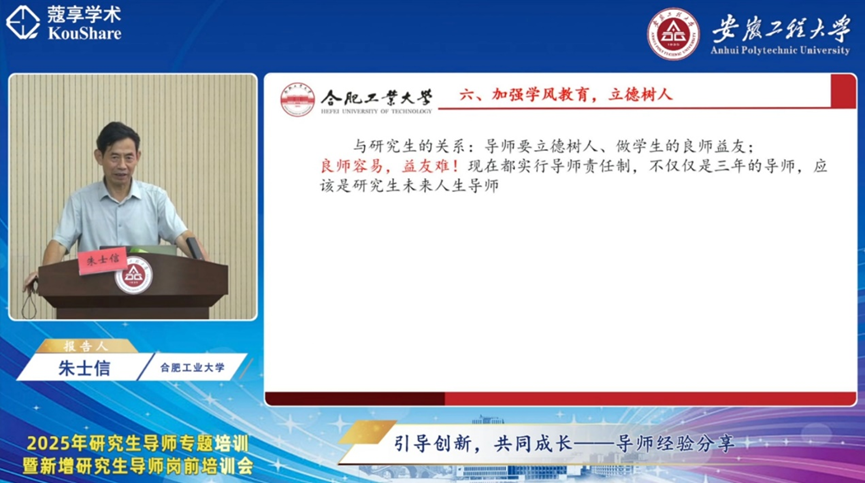 本网讯 9月19日,学校在A座104会议室举行“2025年研究生导师专题培训暨新增研究生导师岗前培训会”,邀请合肥工业大学朱士信教授作专题报告。全体在岗研究生导师,学院分管研究生工作负责人、研究生秘书等参加。会议采用了线上线下同步进行的方式。